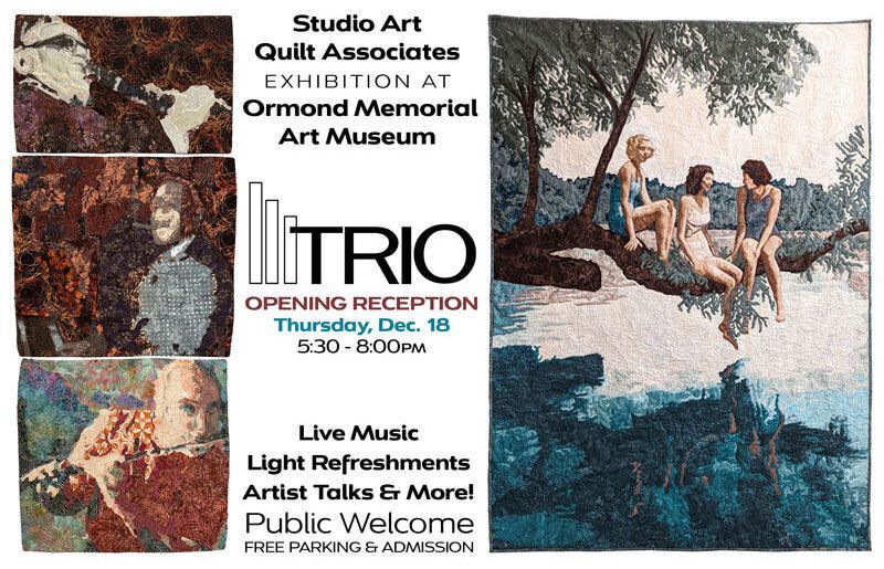 Trios, triples, triads, trilogies, triplets, trinities, triptychs. According to the Rule of Three, ideas, thoughts, events, characters, or sentences that are presented in threes are especially interesting, more effective, and memorable. Like a trio of jazz musicians, three regions — Florida, Georgia, and South Carolina — of the Studio Art Quilt Associates have combined to play with syncopation, swing, and creative freedom. In this juried exhibition, fiber artists respond to the concept of TRIO featuring varying materials, methods and subjects.