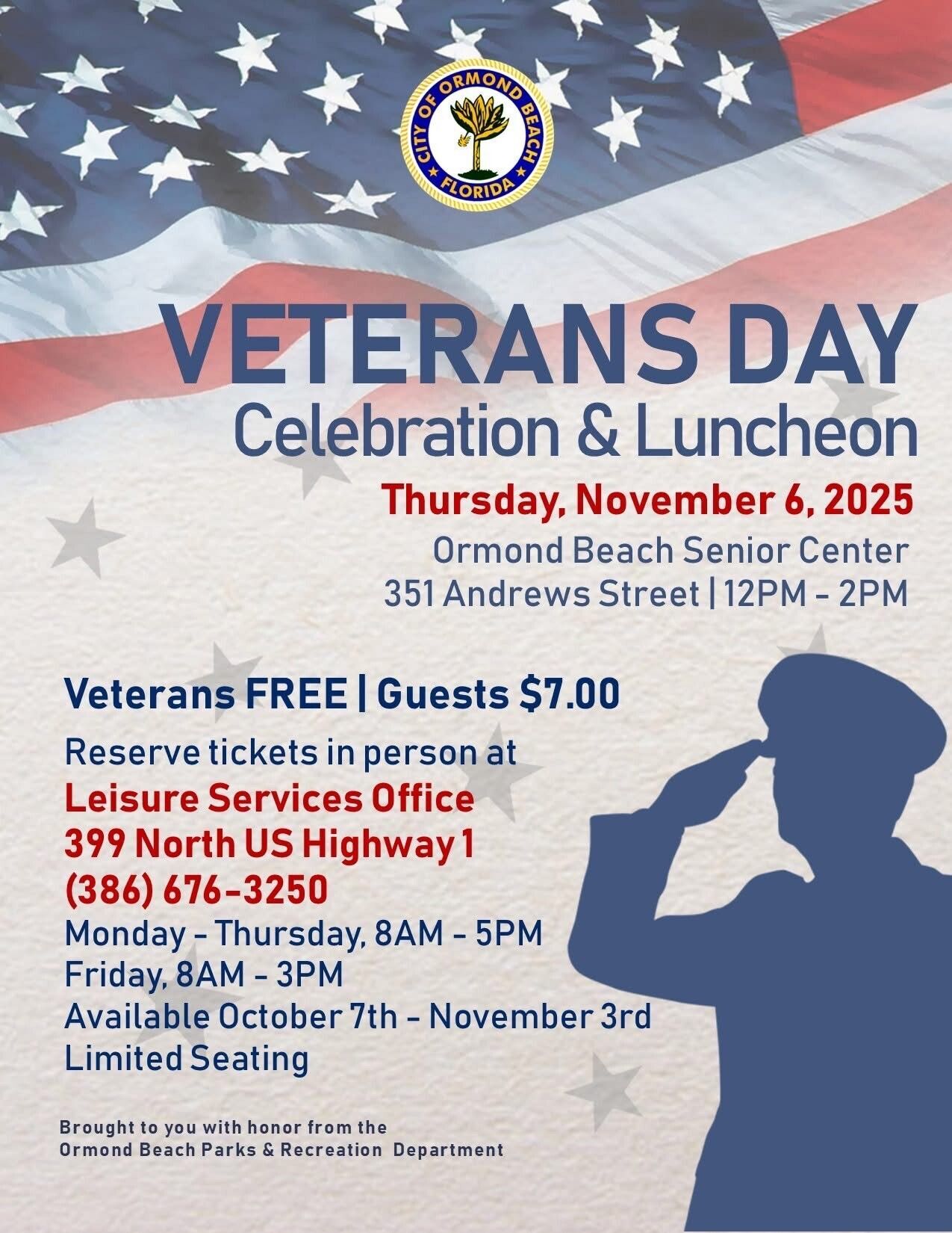 Ormond Beach Parks & Recreation Department present their 2025 Veterans Day Celebration & Luncheon on Thursday, Nov. 6, inside the Ormond Beach Senior Center, 351 Andrews Street.